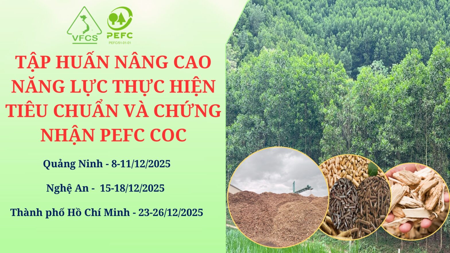 VFCO tổ chức lớp tập huấn nâng cao năng lực thực hiện tiêu chuẩn chuỗi hành trình sản phẩm PEFC CoC cho doanh nghiệp chế biến dăm gỗ và viên nén gỗ, thông tin cụ thể như sau: Đối tượng: Cán bộ, nhân viên, cộng tác viên thu mua nguyên liệu của các doanh nghiệp… Continue reading Tập huấn nâng cao năng lực thực hiện tiêu chuẩn PEFC CoC/DDS