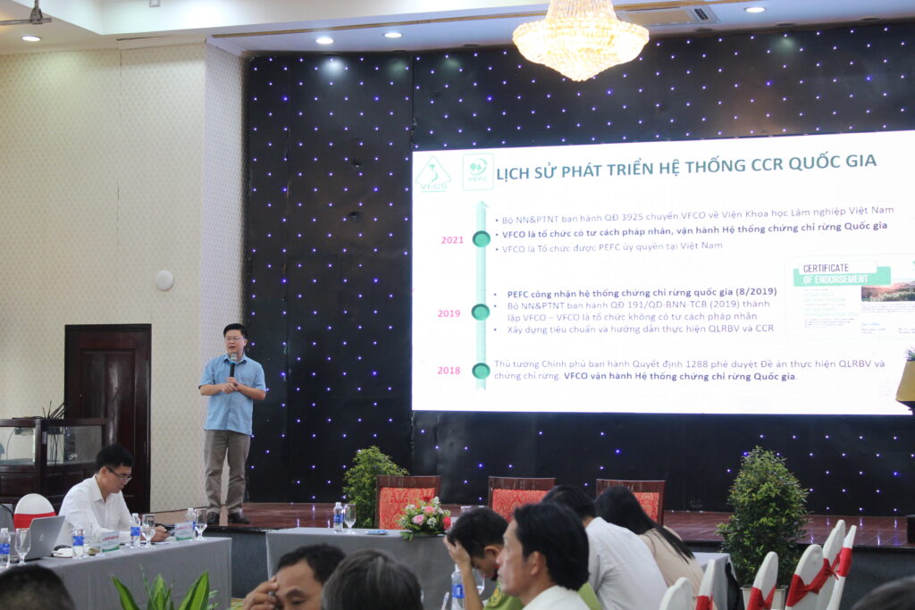 On September 29–30, 2025, VFCO, in collaboration with the National Agricultural Extension Center, organized a workshop on “Developing certified large-diameter plantations for sustainable forest management meeting EUDR requirements” in Gia Lai Province. The workshop brought together 150 participants, including representatives from the Departments of Agriculture and Environment, the Forest Protection Sub-Departments, and the Provincial Agricultural Extension Centers of Gia Lai and neighboring provinces such as Quang Ngai and Dak Lak; local timber enterprises and associations; as well as cooperatives and forest owners in Gia Lai.