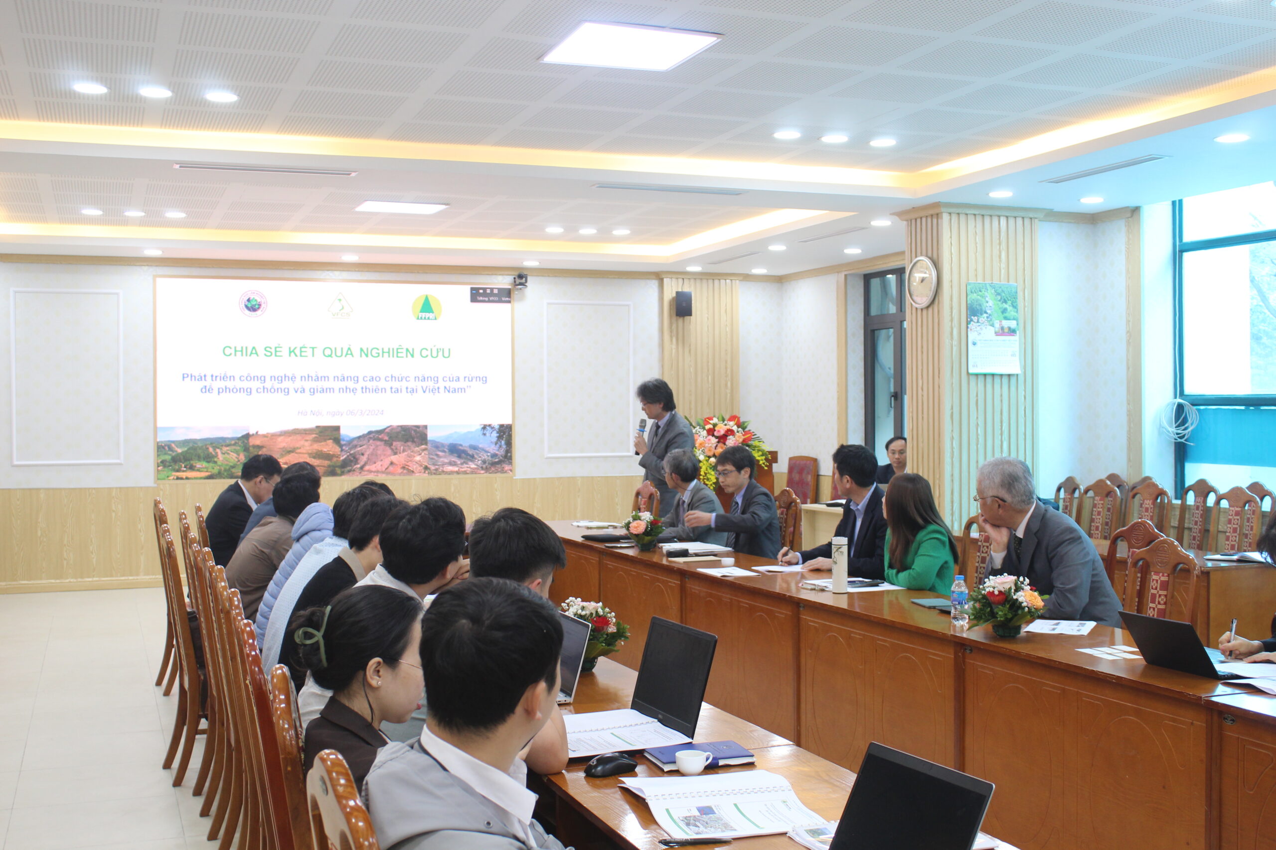 Từ năm 2020, Viện Khoa học Lâm nghiệp Việt Nam (VAFS) và Viện Nghiên cứu Lâm nghiệp và Lâm sản Nhật Bản (FFPRI) đã hợp tác, trong đó Văn phòng Chứng chỉ quản lý rừng bền vững là đối tác thực hiện chính nghiên cứu về “phát triển công nghệ nhằm nâng cao chức năng của rừng trong phòng chống và giảm nhẹ thiên tai tại Việt Nam”. Theo đó, ngày 06/03/2024, hội thảo chia sẻ kết quả nghiên cứu được tổ chức theo hình thức trực tiếp và trực tuyến. Với 45 đại biểu đến từ các tổ chức nghiên cứu, cơ quan quản lý, trường đại học và tổ chức quốc tế, hội thảo đã chia sẻ kết quả nghiên cứu về trượt lở đất và các giải pháp phòng chống, xác định nguy cơ trượt lở đất sử dụng công nghệ viễn thám, trí tuệ nhân tạo; đánh giá hiện trạng và động lực chính dẫn đến trượt lở đất ở vùng đầu nguồn và vai trò, khả năng của rừng ngập mặn trong giảm nhẹ thiên tai. Ngoài các yếu tố khách quan như đặc điểm địa chất, địa hình, thay đổi khí hậu, vấn đề quản lý rừng và sử dụng đất phù hợp và bền vững là một trong các giải pháp quan trọng trong phòng chống và giảm nhẹ thiên tai, sự phát triển bền vững của quốc gia.
