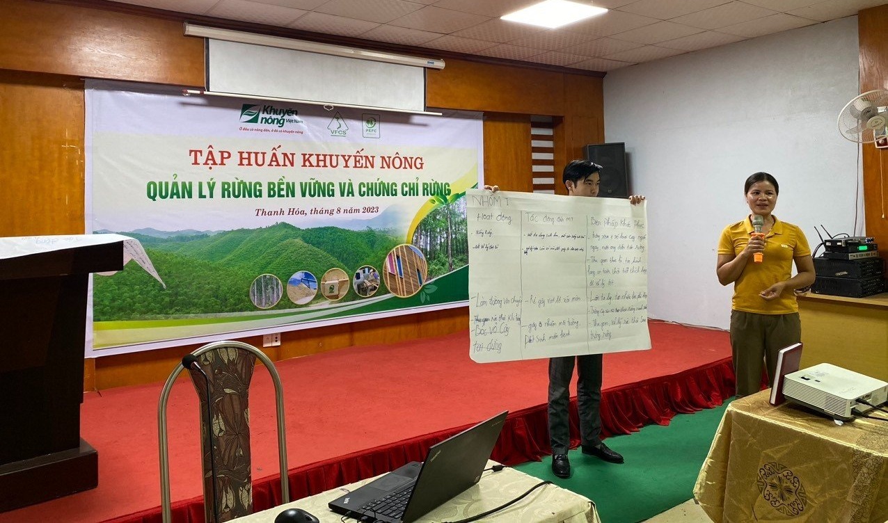 Từ ngày 1-3/8/2023, tại KS Hoa Hồng, TP Thanh Hóa, Văn phòng Chứng chỉ Quản lý rừng bền vững (VFCO) phối hợp với Trung tâm Khuyến nông tỉnh Thanh Hóa tổ chức lớp tập huấn về Quản lý rừng bền vững và chứng chỉ rừng. Tham gia lớp tập huấn có 40 học viên là cán bộ khuyến nông, cán bộ kỹ thuật và nông dân trên địa bàn tỉnh Thanh Hóa.