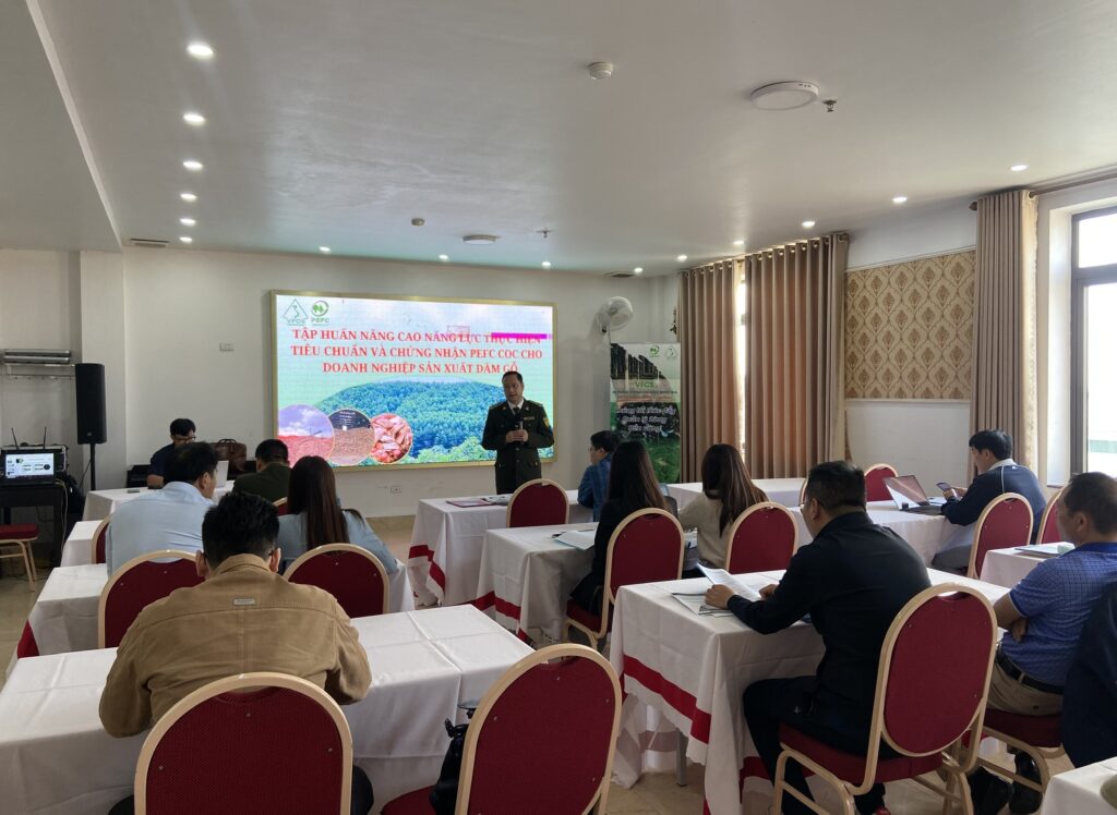 Lớp tập huấn thu hút sự tham gia của khoảng 30 học viên là cán bộ quản lý, nhân viên phụ trách sản xuất, nhân viên thu mua nguyên liệu của các doanh nghiệp sản xuất dăm gỗ trên địa bàn tỉnh Quảng Ninh, Bắc Giang, Lạng Sơn và Hà Nội. Mục tiêu của lớp tập huấn là trang bị và nâng cao năng lực cho doanh nghiệp trong việc thiết lập, vận hành và duy trì hệ thống Chuỗi hành trình sản phẩm (CoC) và hệ thống Trách nhiệm giải trình (DDS) theo tiêu chuẩn PEFC.